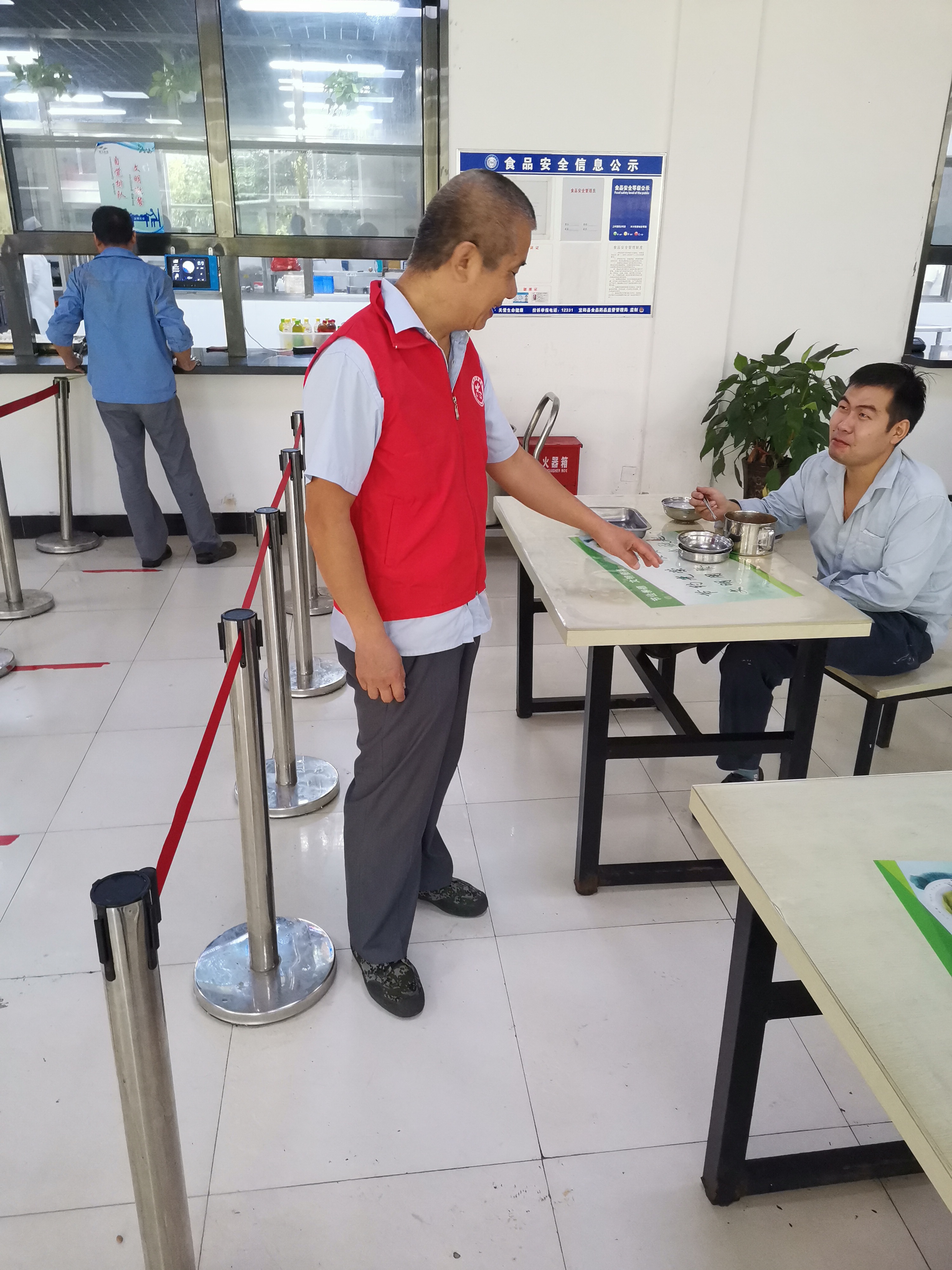 上午10:50 “文明餐桌志愿服務(wù)隊(duì)”成員已穿上紅馬甲,在職工餐廳集合,擺放好餐桌上的隔離擋板和椅子,規(guī)置好餐廳取餐窗口的警戒欄桿。11:00開(kāi)飯時(shí)間到,陸續(xù)有員工到達(dá),11:30各車(chē)間員工、外協(xié)檢修人員同時(shí)到達(dá)職工餐廳形成就餐高峰。通過(guò)“紅馬甲“的指引勸導(dǎo),職工們根據(jù)飯量不同,按需打菜,垃圾桶里剩菜剩飯明顯減少,取餐窗口排隊(duì)秩序井然,單人單桌就餐或雙人隔板就餐文明規(guī)范。